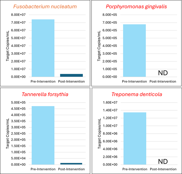 Interpretation: Within two months, the combined mechanical + antibiotic + ProBiora probiotic/ SuperMouth rinse strategy substantially altered the oral microbiome, reducing hard‐to‐treat red complex bacteria to undetectable levels in the mouth. This shows the protocol can work within 60 days with consistent patient compliance.